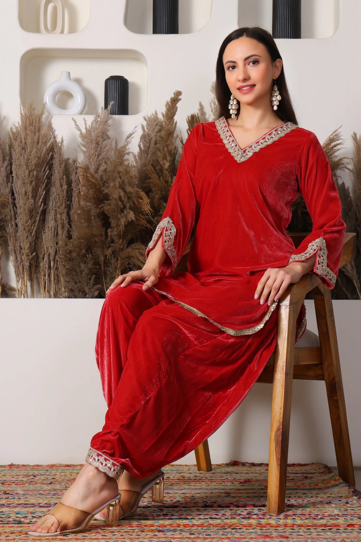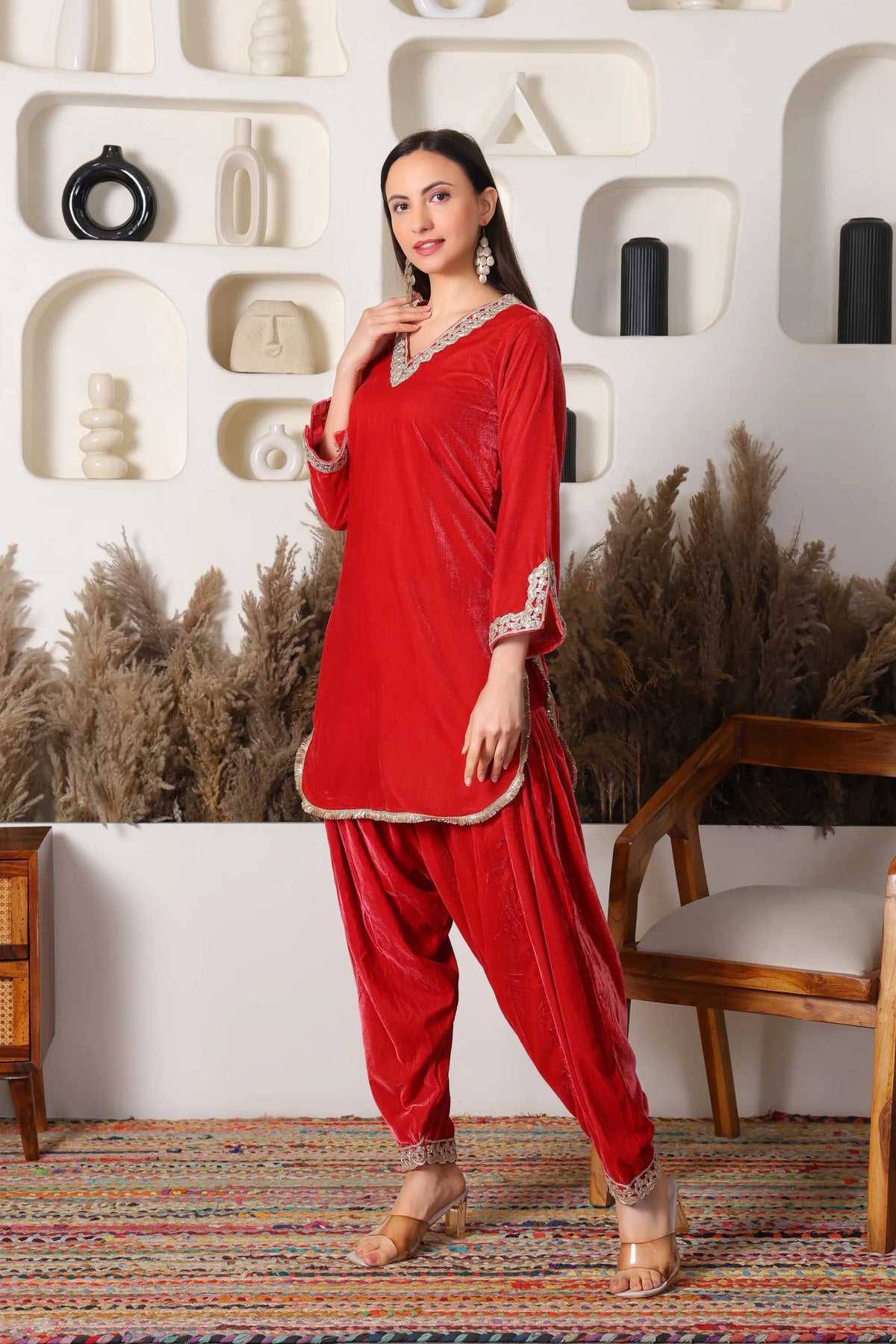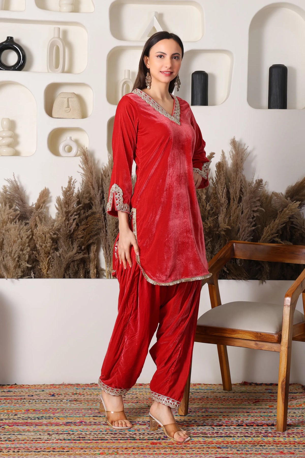 Shabnami, a collection inspired by the soft shimmer of morning dew, brings together the luxurious elegance of velvet with timeless traditional silhouettes. Each Velvet Kurta with Salwar in this collection is crafted to evoke grace and quiet opulence, blending rich textures with delicate detailing. The deep, regal hues and plush feel of velvet create an aura of sophistication, while the classic salwar design ensures comfort and fluidity in every movement. Shabnami celebrates femininity with a touch of mystique perfect for occasions where you wish to shine with subtle, refined beauty.