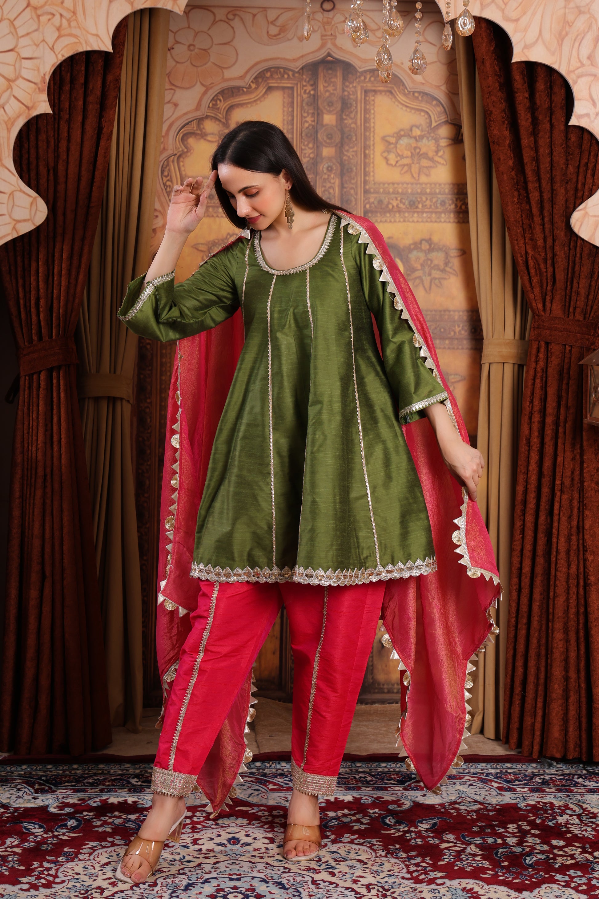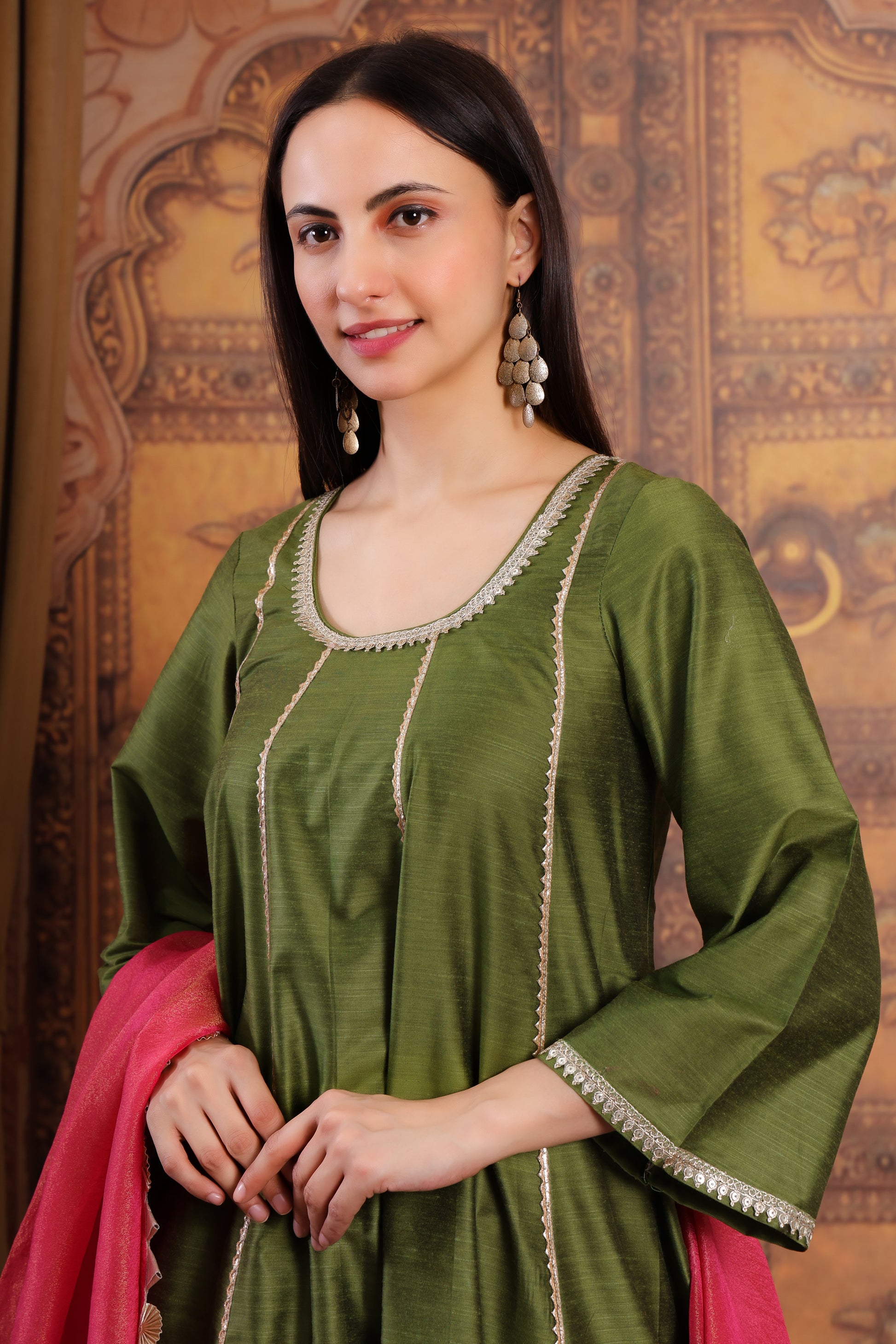 +Effortless elegance meets contemporary style in this A-Line Kurta Set, crafted for both comfort and sophistication. The A-line silhouette offers a graceful flow with a flattering fit, making it versatile for festive as well as semi-formal occasions. Paired with a shimmering tissue silk dupatta, the ensemble is elevated with a touch of luxury and charm. Perfect for celebrations, evening gatherings, or traditional festivities, this set is a timeless addition to your wardrobe.