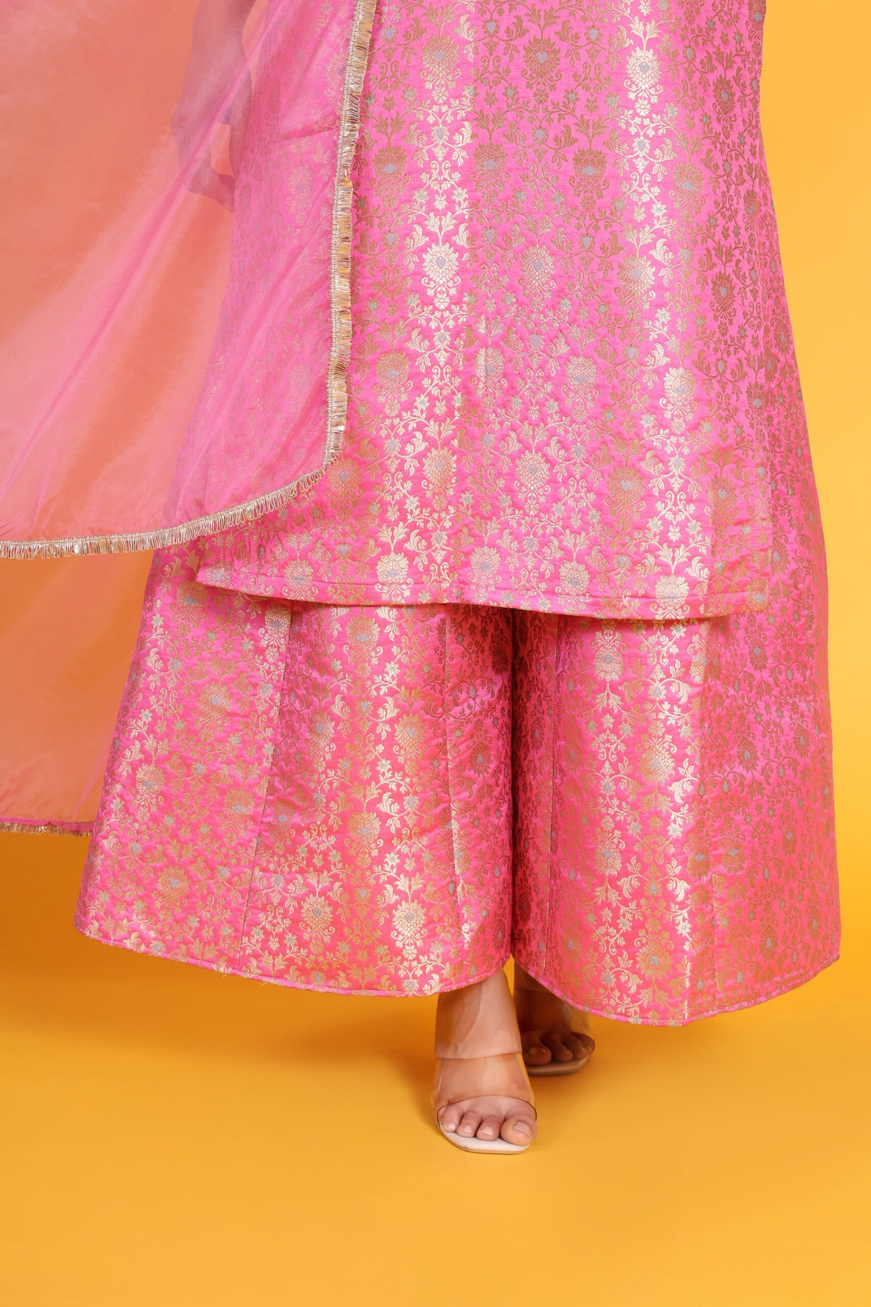 +This Banarasi Silk Kurta with Sharara set is a perfect blend of traditional elegance and modern comfort. The luxurious Banarasi silk fabric is complemented by intricate detailing, while the kurta features a flattering V-neck and half sleeves for a relaxed fit. Paired with a graceful sharara, this ensemble is ideal for festive occasions and celebrations, offering both style and comfort. Make a statement with this stunning outfit, designed to bring sophistication to any special event.