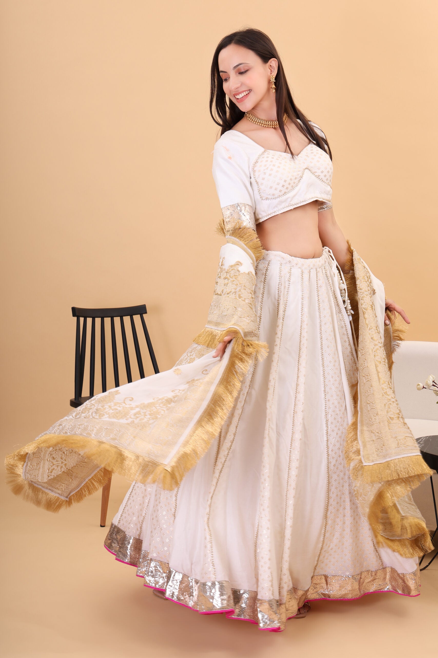 - Lehenga Fabric: Premium Chanderi silk, offering a lightweight and glossy finish with a subtle sheen.