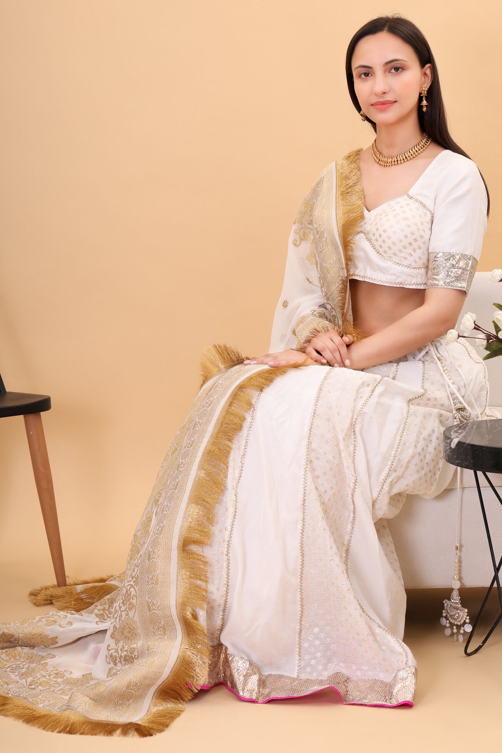 +Introducing our elegant Chanderi Silk Lehenga Set paired with a flowing Georgette Dupatta, a perfect fusion of tradition and contemporary design. The Chanderi silk lehenga, known for its lightweight and luxurious feel, is paired with a soft georgette dupatta that drapes effortlessly, making it a standout piece for any festive or wedding occasion.