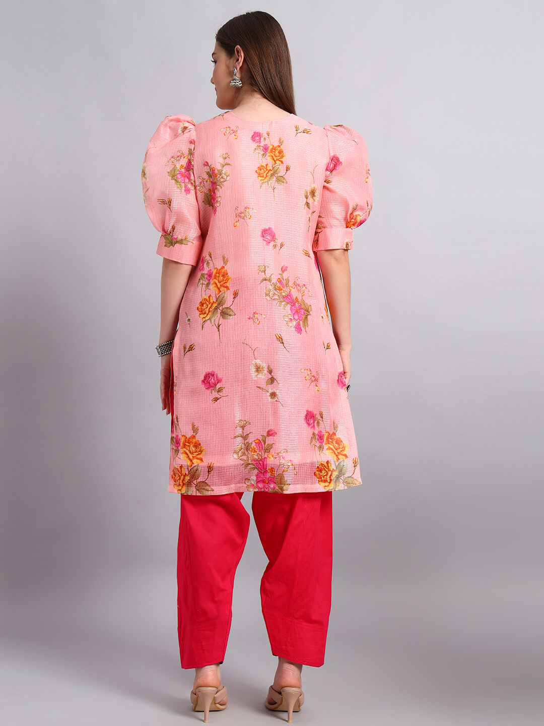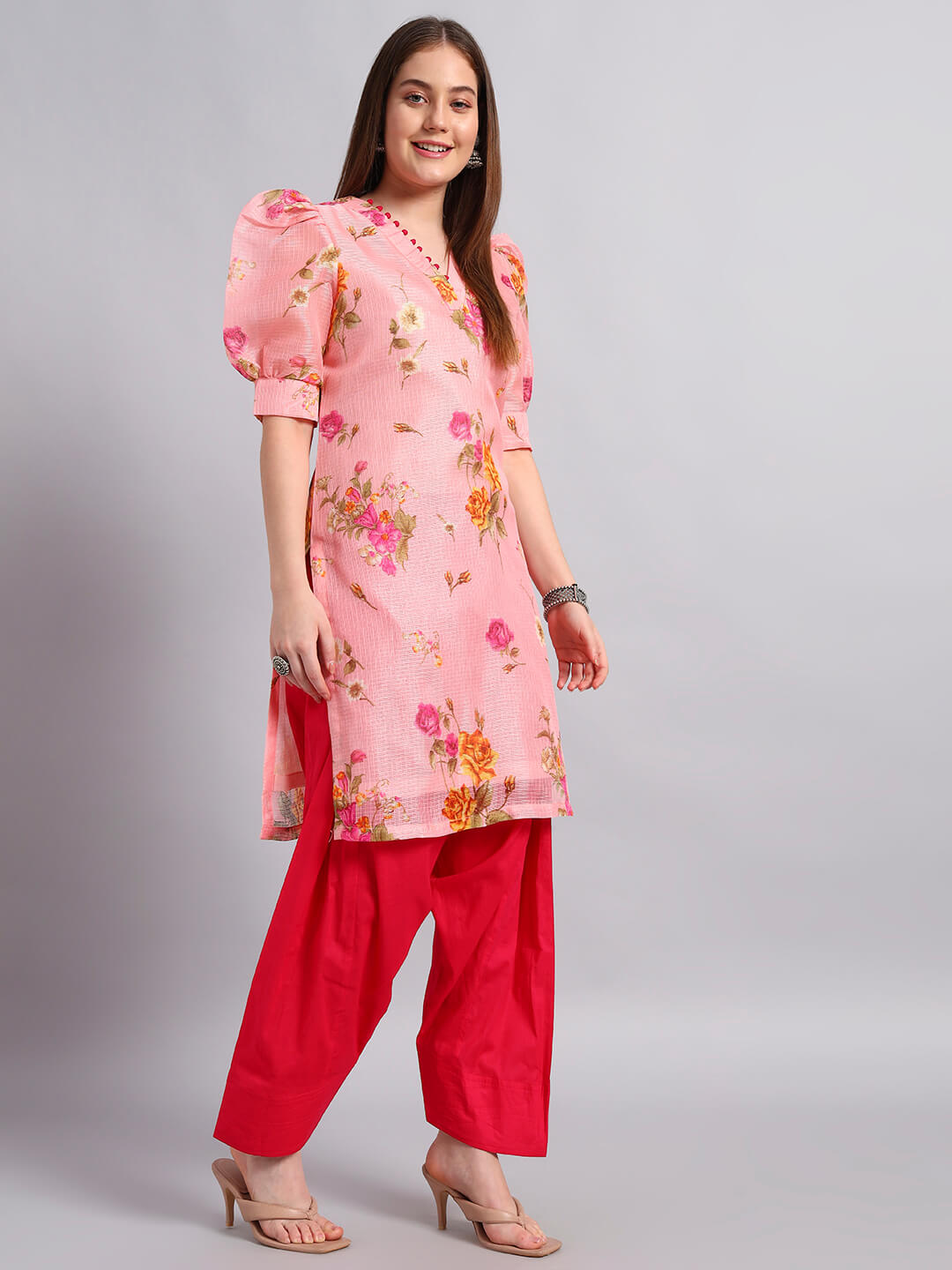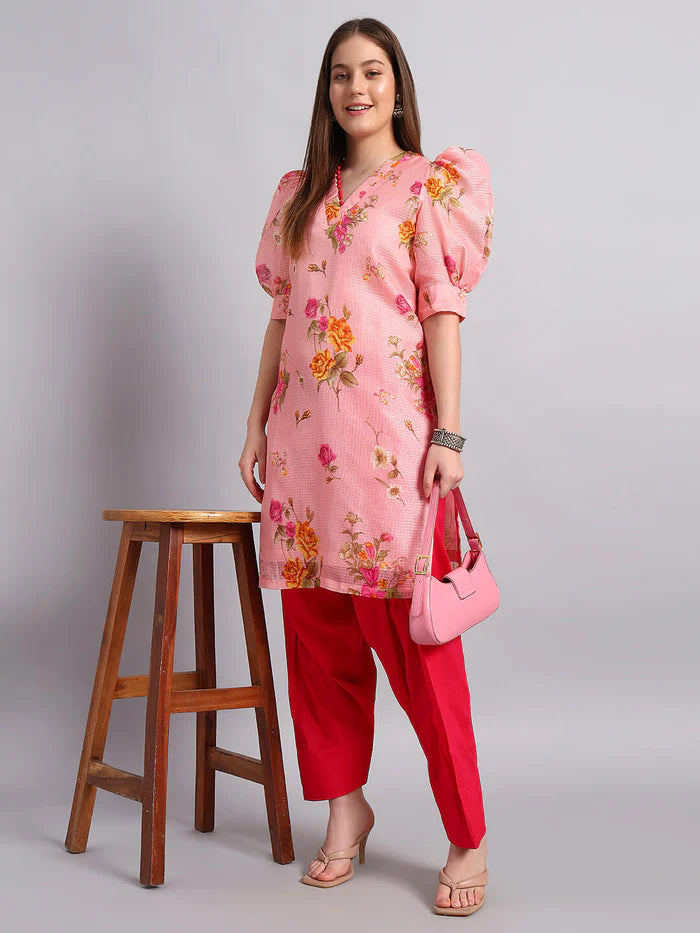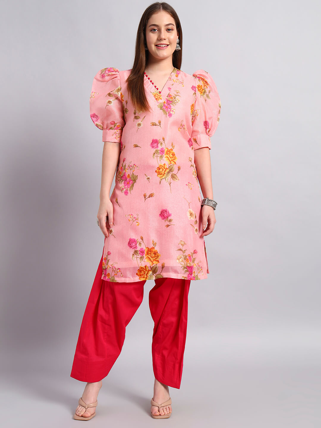 +Delicate, airy, and effortlessly graceful, this Floral Print Kotadoria Kurta Salwar Set is a perfect blend of elegance and ease. Crafted from the lightweight and breathable Kota Doria fabric, the kurta features soft floral prints that bring a fresh, feminine touch to the ensemble. The subtle texture and semi-sheer quality of the fabric add depth and charm, while the accompanying cotton salwar ensures comfort and fluidity in movement. Ideal for summer days, casual gatherings, or festive mornings, this set offers a refined look rooted in traditional craftsmanship.