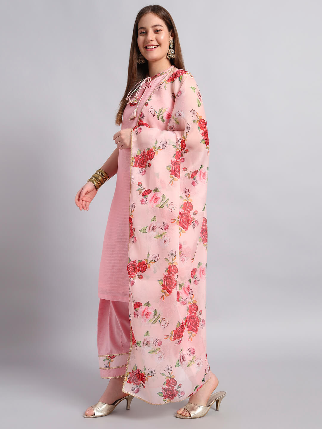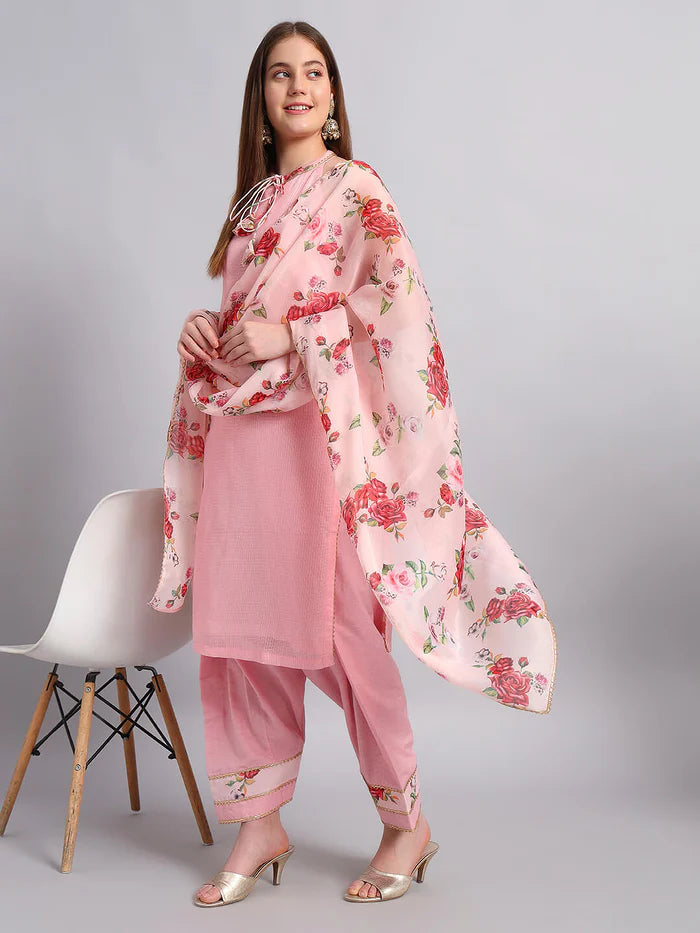 +Elegant and timeless, this Kotadoria Kurta Set with Organza Floral Dupatta brings together traditional craftsmanship and modern femininity. The kurta, made from lightweight and breathable Kota Doria fabric, features a subtle texture and crisp silhouette that offers both comfort and sophistication. Paired with coordinated bottoms, the set is elevated by a sheer organza dupatta adorned with delicate floral prints—adding a soft, romantic charm to the look. Ideal for festive gatherings, daytime events, or refined everyday wear, this ensemble is a beautiful expression of understated elegance.