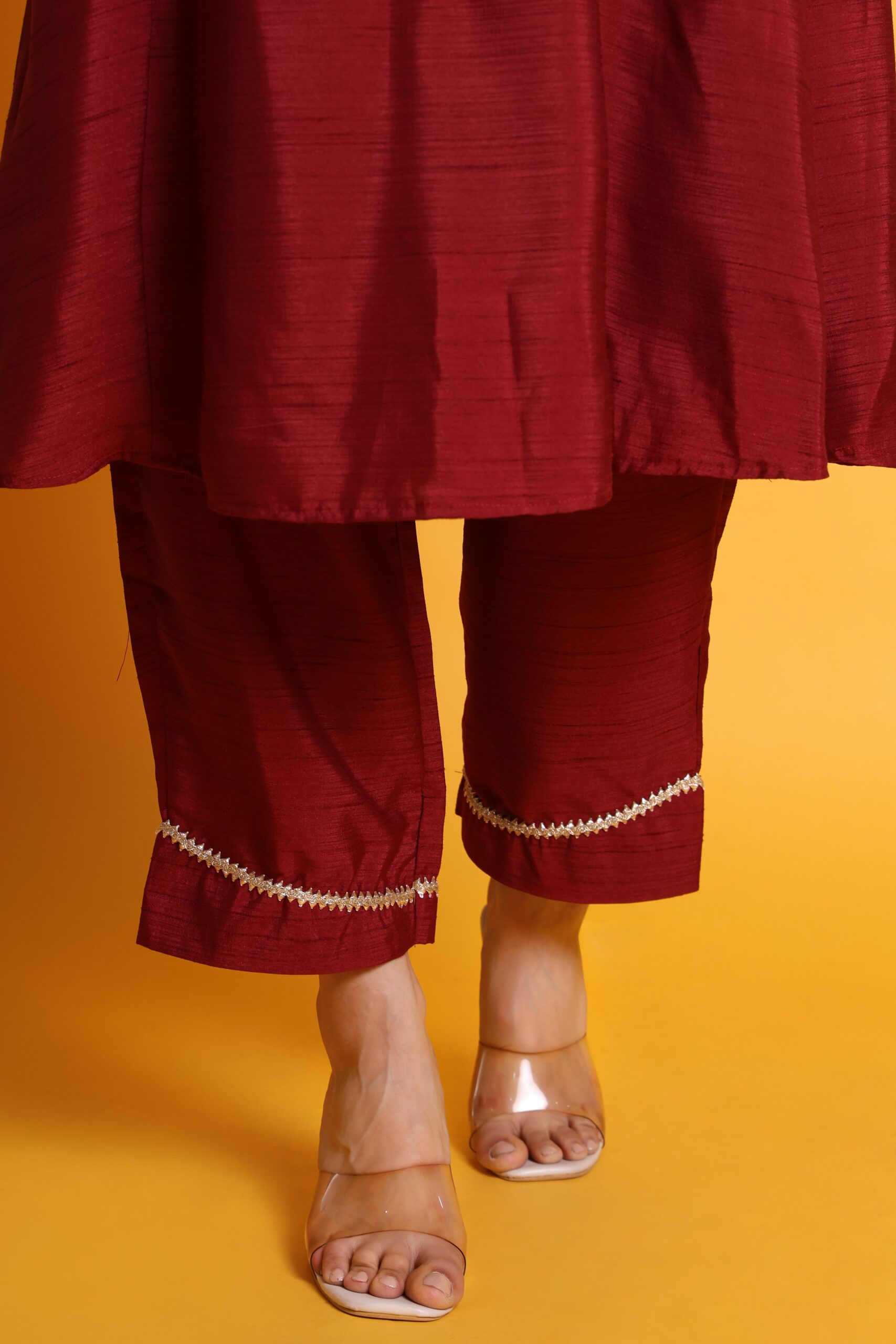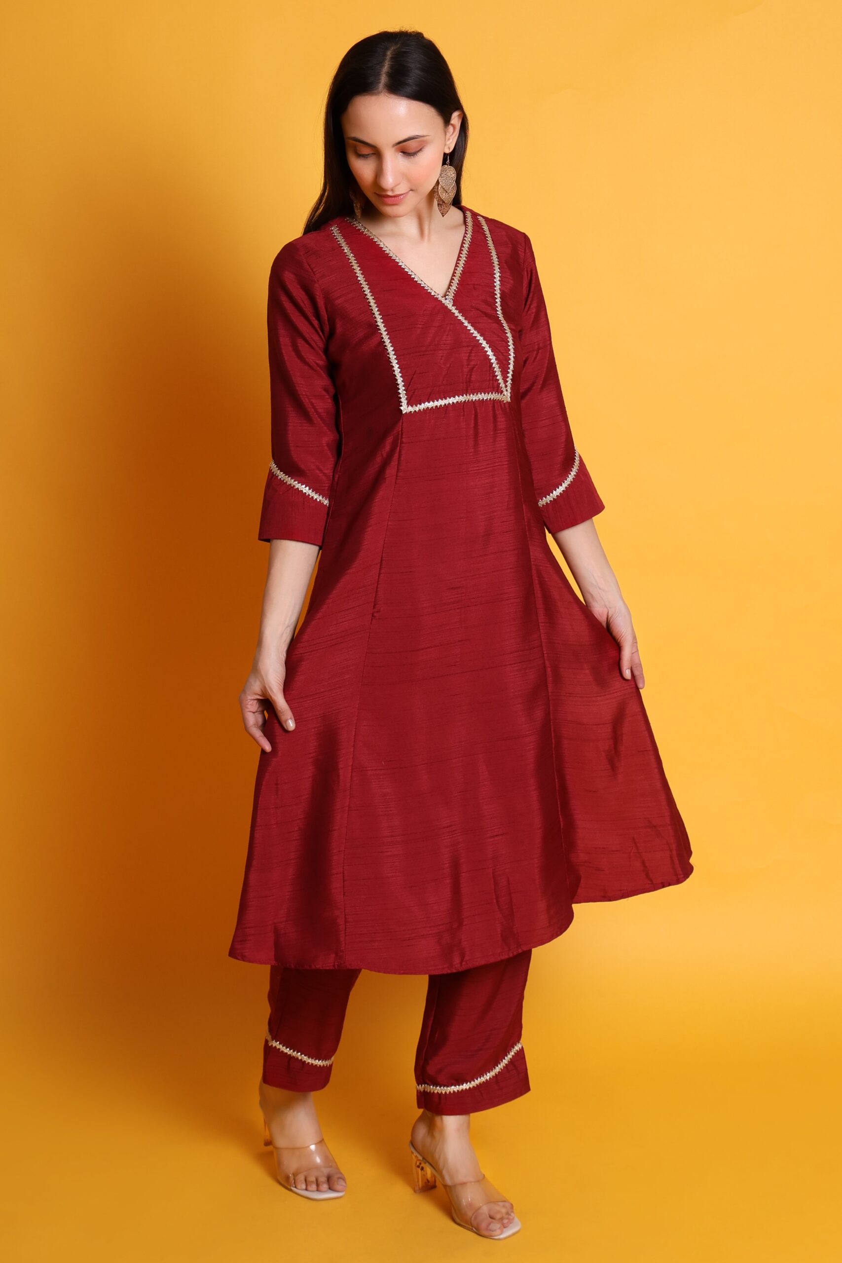 +This Satin Dupion Kurta Set with Lace Work offers a perfect blend of comfort and elegance. The luxurious satin dupion fabric gives the kurta a smooth, polished look, while the intricate lace detailing adds a touch of sophistication. Featuring a stylish angrakha neck and quarter sleeves, this set provides a relaxed yet refined fit, making it ideal for both festive and semi-formal occasions. Embrace timeless charm and effortless style with this beautiful ensemble.