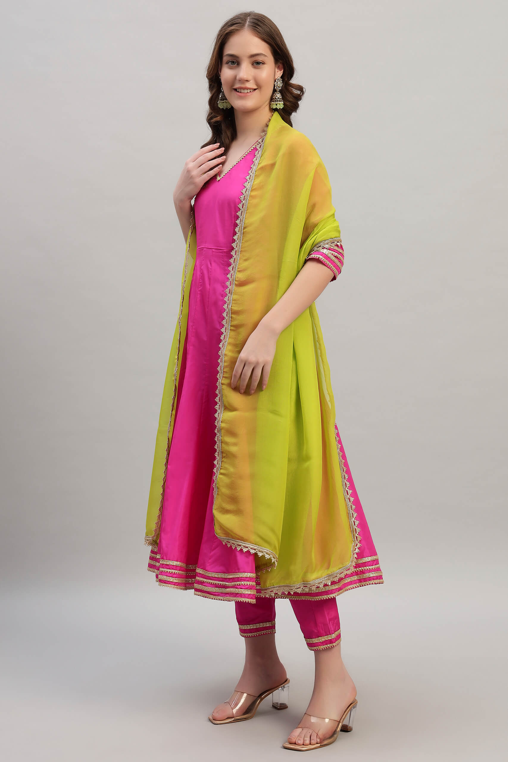 +Make a grand impression with this Silk Anarkali Kurta Set, a perfect blend of luxury and tradition. Crafted from rich, lustrous silk, the Anarkali kurta features a flowing, flared silhouette that exudes regal charm and sophistication. The fabric’s natural sheen enhances its festive appeal, making it ideal for weddings, celebrations, and special occasions. Paired with matching bottoms and a complementing dupatta, this set offers a graceful, head-turning look. Elegant, timeless, and effortlessly stylish, it’s designed for those who appreciate the beauty of classic craftsmanship with a refined touch.